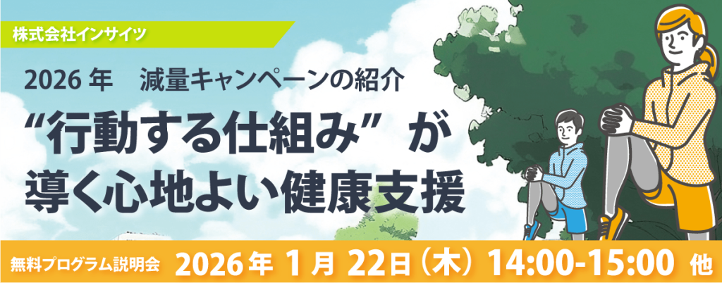 本説明会では、プログラムコンセプトである「参加しやすい」「続けやすい」をテーマに、「行動する仕組みが導く心地よい健康支援」として、今現在の健康支援の施策に必要な考え方や取り組み方、2026年の減量キャンペーンの進め方についてご説明させていただきます。
